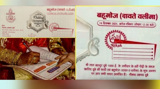विशाल भारत संस्थान के जिला अध्यक्ष नौशाद अहमद 'दुबे' द्वारा जारी किया गया शादी की दावत (वलीमा) का निमंत्रण पत्र सोशल मीडिया पर तेज़ी से वायरल हो रहा है।